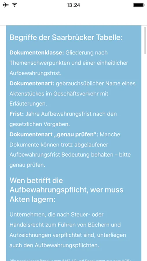 Diese App ist die mobile Version der Saarbrücker Tabelle, einer Gesamtübersicht alle aufbewahrungspflichtige Dokumente. Neben der Aufbewahrungsfrist sehen Sie das korrekte Vernichtungsjahr für Ihre aktuellen Akten und welche Akten Sie bereits vernichten können. Sauber getrennt für jede Dokumentenart.
