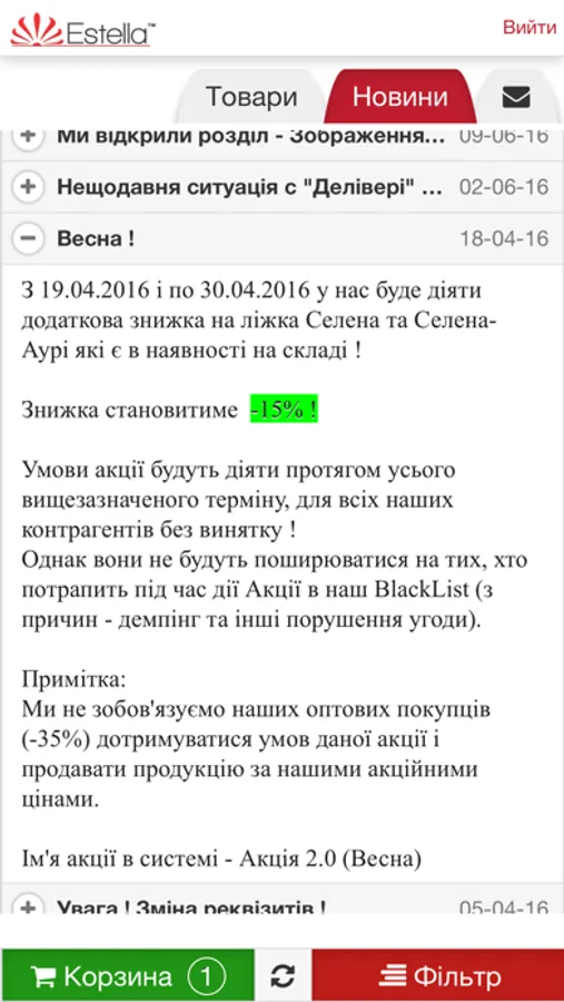 Служебное бизнес приложение позволяющее зарегистрированным в компании клиентам просматривать реальные остатки продукции на главном складе с возможностью её отбора для формирования закупки. С последующим созданием комплексного заказа и его отправкой для выполнения на стороне склада. Также, приложение публикует новости от компании и другие события связанные только со своей деятельностью. Создано для ускорения и поддержки общей системы дистрибуции сети сбыта Эстелла™.