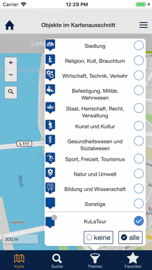 - Folgen Sie einer Story und gehen Sie mit den KuLaTouren auf Entdeckungstour: Interessante Themen werden jetzt direkt als KuLaTouren gebündelt angezeigt. Sie sind Vorschläge für eine themenspezifische Entdeckung der Umgebung. Die Reihenfolge der Objekte wird durch ein Ziffernsymbol angezeigt. Bei Auswahl der Route werden diese Ziffern in der Kartendarstellung rot dargestellt. Nichtausgewählte KuLaTouren sind grau hinterlegt. Die Navigation erfolgt extern durch die Koordinatenübergabe an ein beliebiges Navigationssystem. KuLaTouren sind standardmäßig in der Themenansicht ausgeblendet! Für eine Suche nach Touren muss hier das Häkchen gesetzt werden.