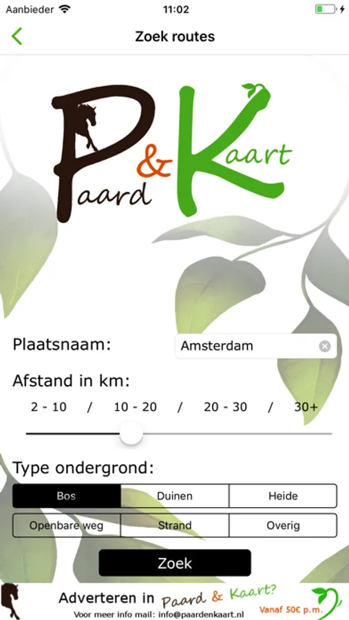 - ‘zoek routes’, zoek een geschikte route om te rijden. Je kunt zoeken op afstand, locatie en ondergrond (bos, heide, duinen, strand, openbare weg en overig).
