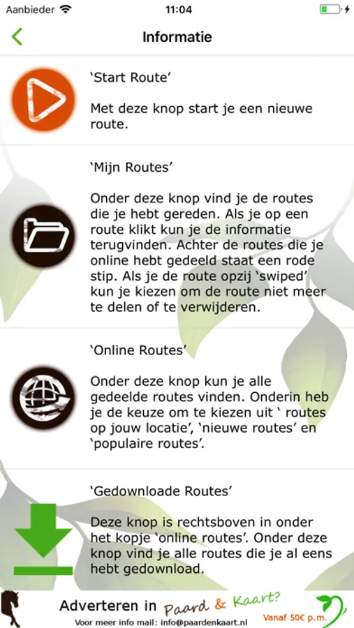 - ‘eigen routes’, je gereden routes kun je opslaan op je eigen telefoon. Als deze route langer is dan 2 km kan je deze uploaden zodat andere ruiters deze route ook kunnen rijden.