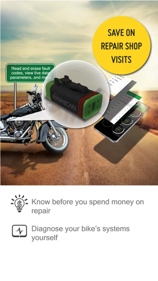 NOTE: This app works with MotoLink and Motorscan adapters only. Do not use your smartphone app while riding.