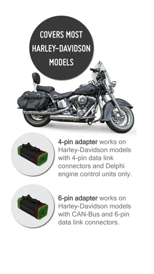MotoLink works on most Harley-Davidson bikes. There are two types of adapters available. The 4-pin adapter is compatible with 2013 and older models with Delphi engine control units and 4-pin OBD connectors. The 6-pin adapter works with 2011 and newer Harley-Davidson bikes with CAN-Bus and 6-pin OBD connectors. Please visit https://motolink.net/motolink1hd.html to check compatibility with your bike.