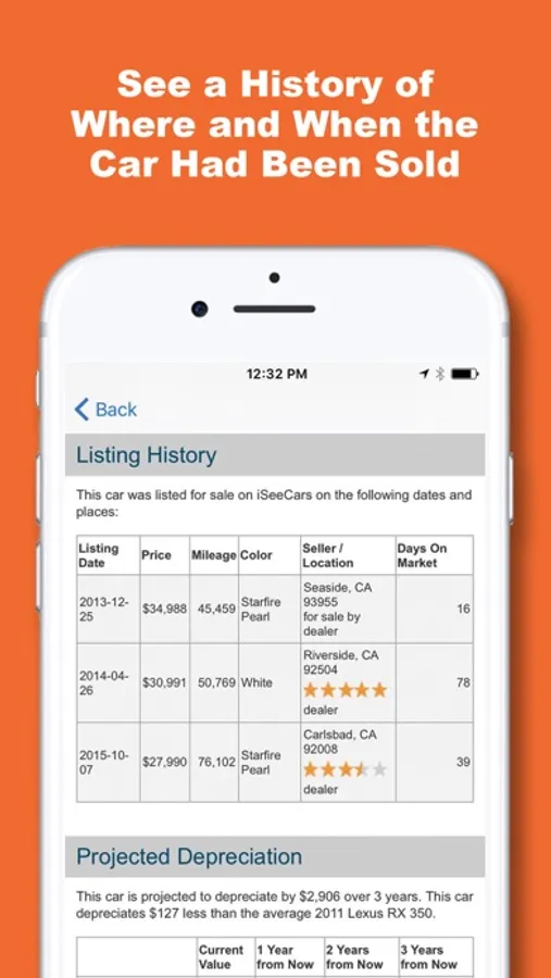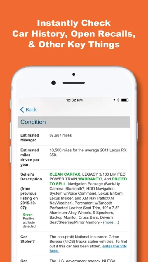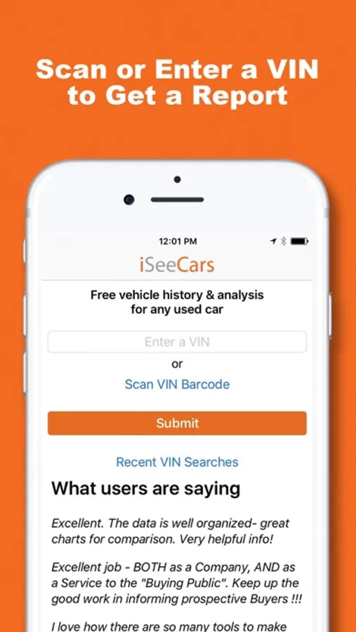 >> Better than CarFax. Won't ever shop for a car without this app.
