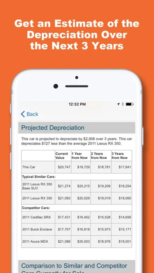 Get an estimate of how much the used car will depreciate over 1, 2 and 3 years and in comparison with similar and competitor cars.