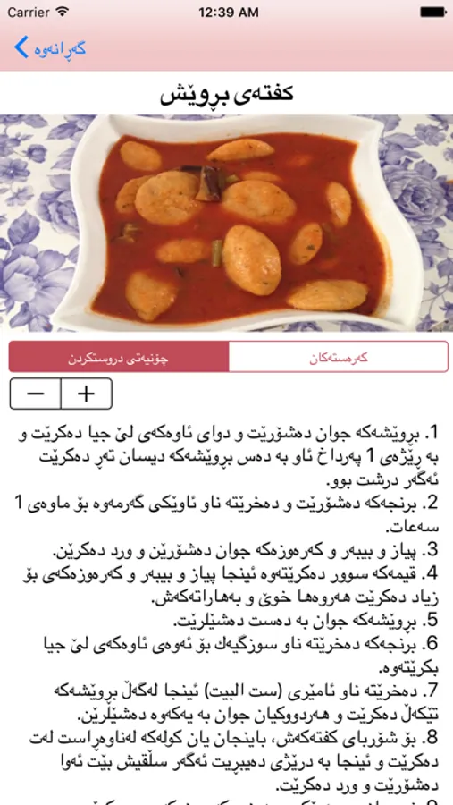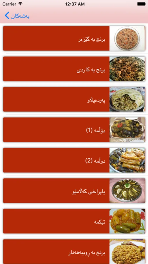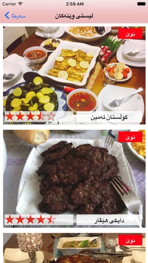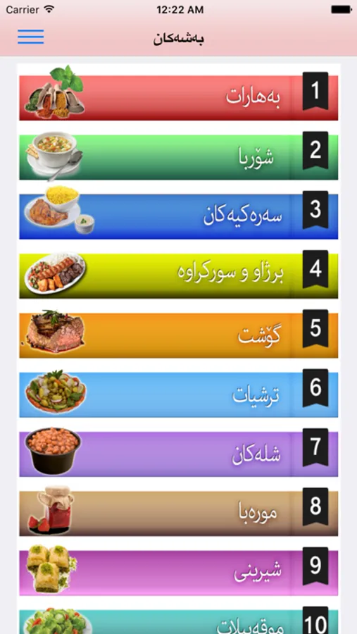ئهم ئهپه له ١١٠ جۆر خواردن پێكهاتوه كه له ١٠ بهش كۆكراونهتهوه. زۆربهی خواردنهكان خواردنی كوردین و به شێوهیهكی ئاسان و ساده باس كراون.