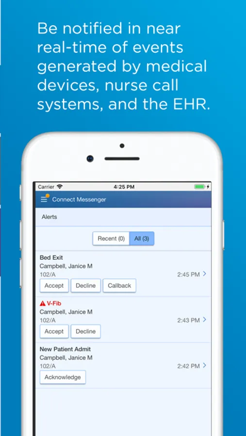 • Receive alerts and notifications from medical devices, nurse call systems, and Electronic Health Record (EHR)