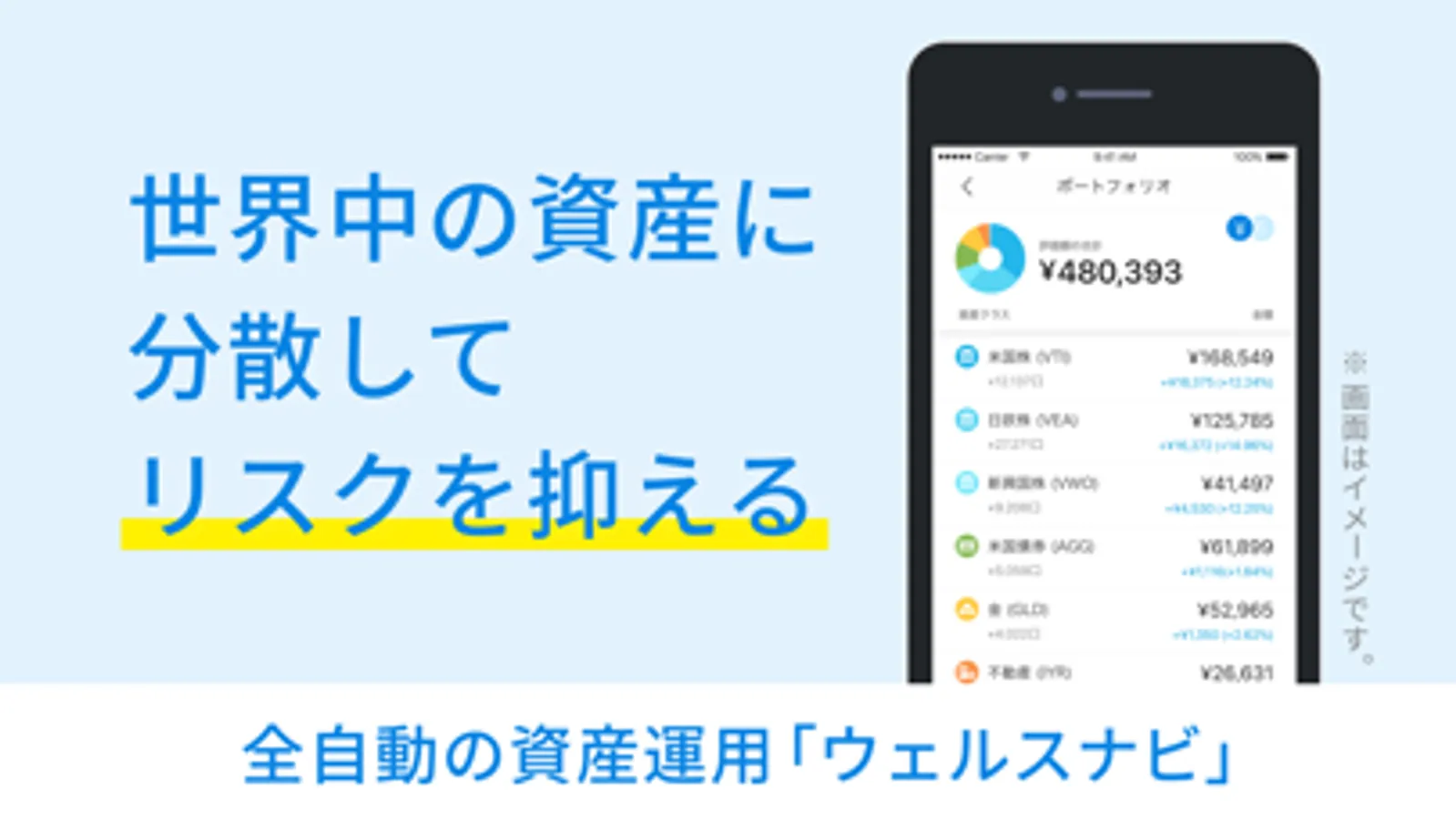 WealthNavi(ウェルスナビ)は、約50カ国1万2,000銘柄に分散投資を行い、世界経済の成長を上回るリターンを目指す自動でおまかせの資産運用アプリです。