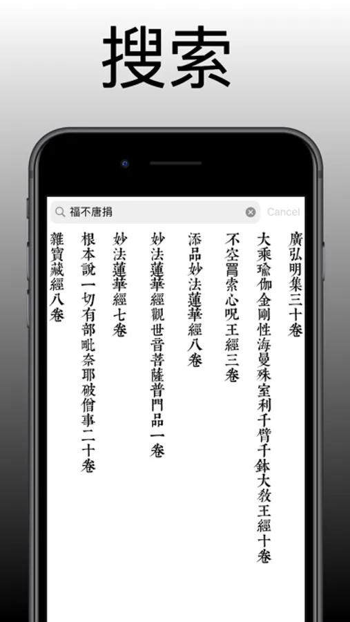 强大的搜索功能:如果你要在大藏经中查找某篇经文,或者想知道某个词语在哪些经文中出现过,可以使用搜索来快速得到完整的答案。这是我开发它的一个重要起因。