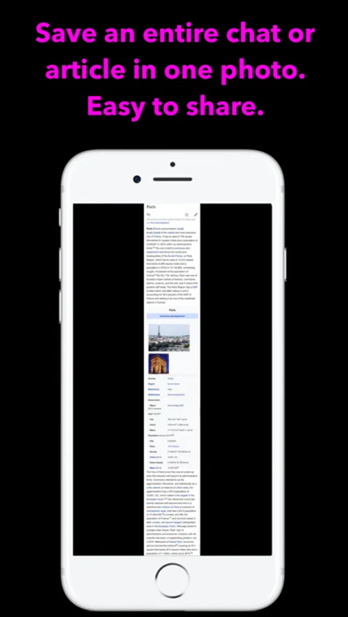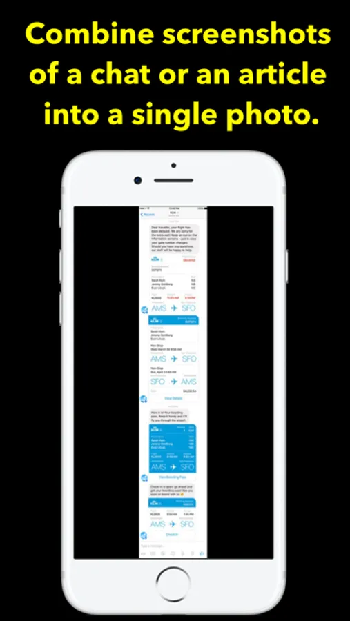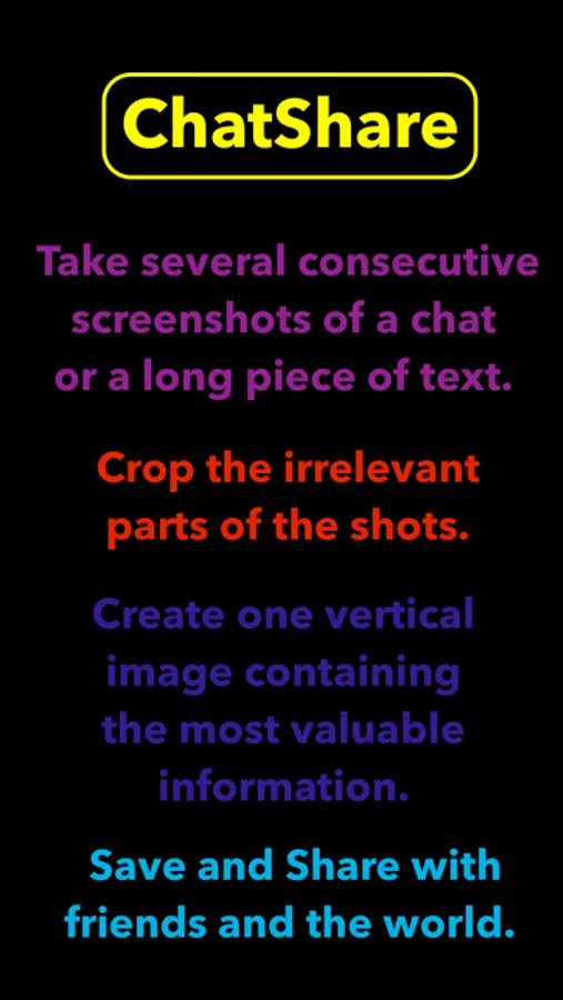 A great app for sharing chat conversations with friends. You can capture screenshots of a conversation from any messaging app. Open ChatShare and select the pictures, crop the unnecessary parts and combine them in one picture (one on top of another). Share it with friends.