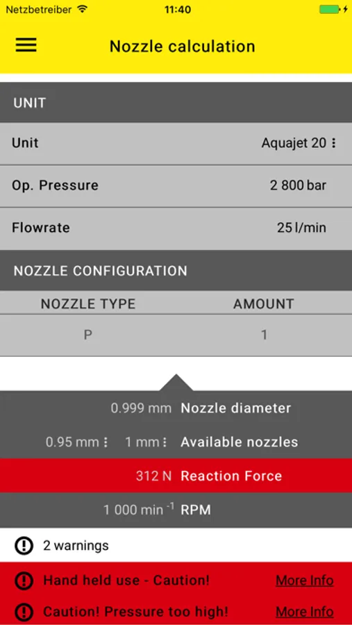 The results are assessed in text and a multitude of relevant values shown: operating pressure, flow rate, pressure loss, rpm of the pump, reaction force resulting from the nozzle assembly and much more.