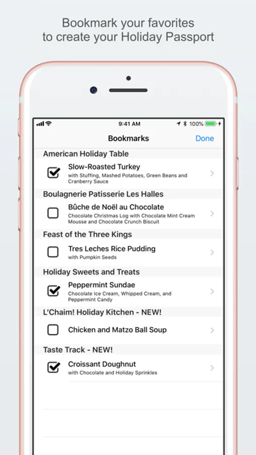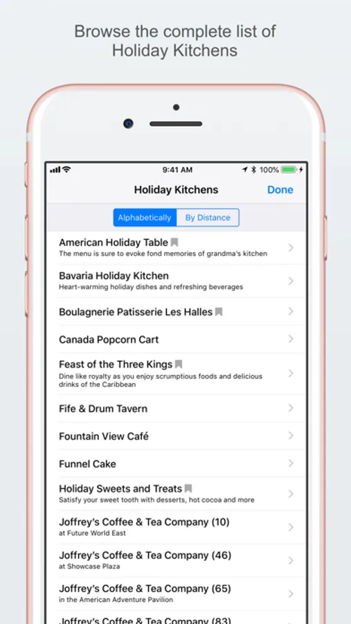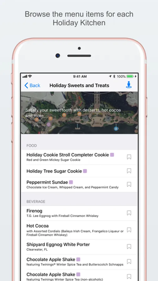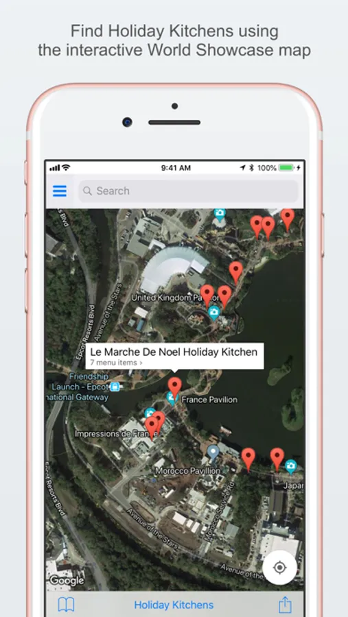 - While inside Epcot®, use your iPhone's GPS location to browse the list of Holiday Kitchens that are nearby