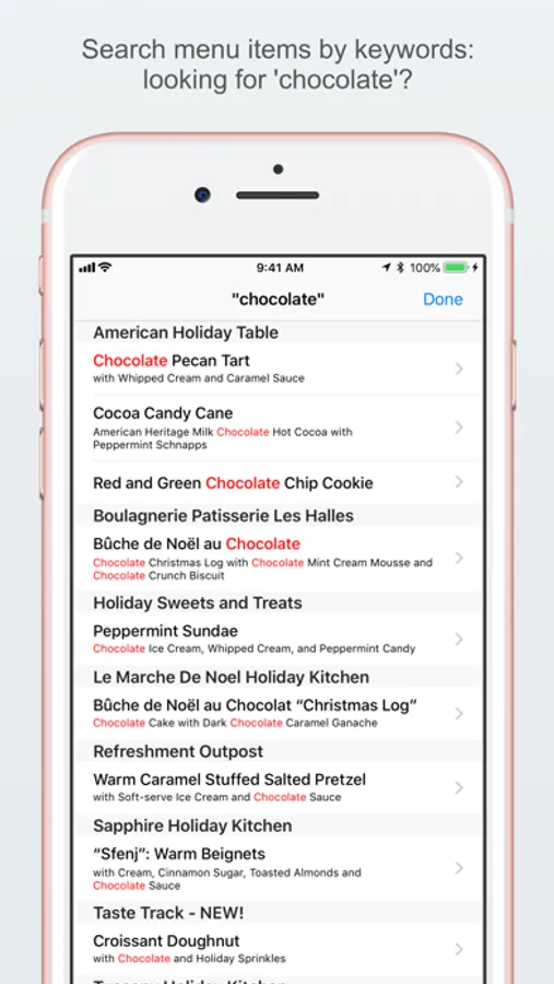 - Search the list of menu items by keywords. Looking for a dish containing "chocolate"? Or a good "eggnog"? You may also use Spotlight to search the menu items.