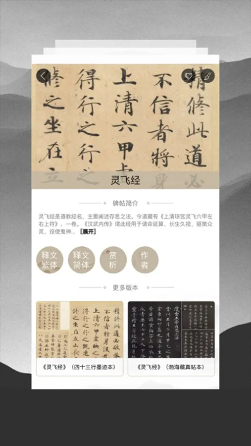 1. 碑帖展示:展示高清图片、释文、译文、作者、赏析、版本流传等资料。