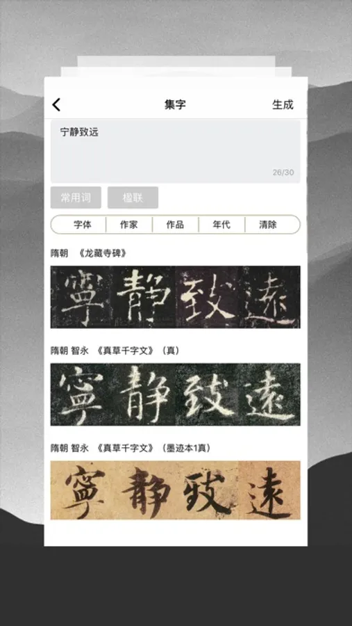 3. 集字功能:根据诗词内容,缀合碑帖图片;可选择常用词或楹联集字。