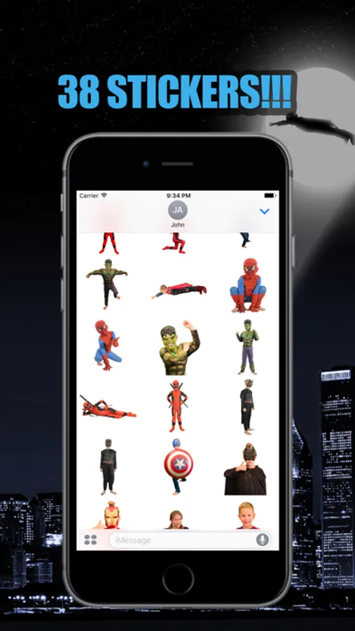 Included in the full sticker pack are over 35 total stickers. Press and hold on the sticker to peal them off and place them over pictures, text messages, or just send them like you would a photo. For the most fun, try out the GIFs to really bring your favorite SuperHeroKid to life.