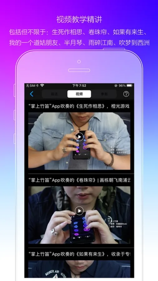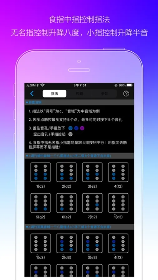 • 吹奏时,食指中指控制指法,无名指控制临时升降八度,小指控制临时升降半音,拇指用于掌控iPhone
