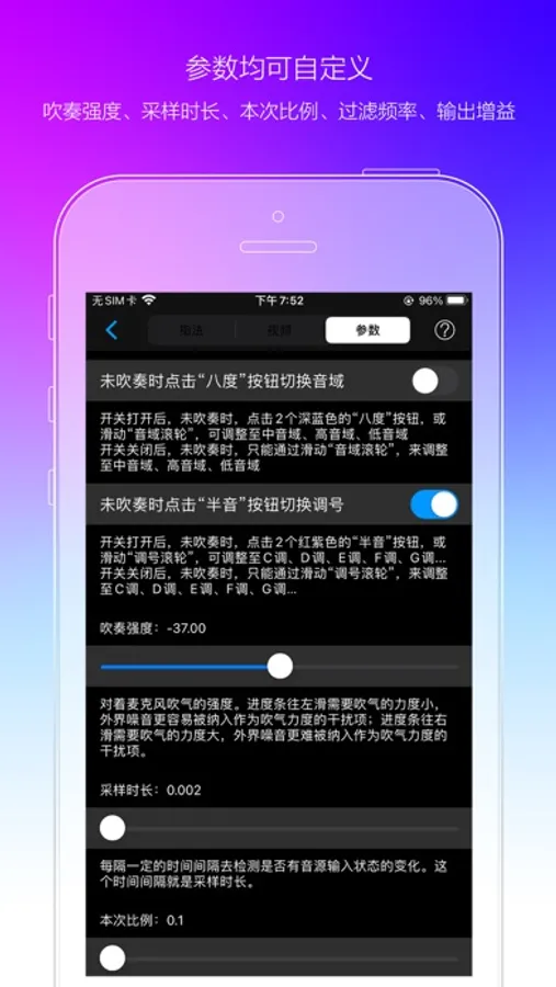 • 提供19个调:F、#F、G、#G、A、#A、B、c、#c、d、#d、e、f、#f、g、#g、a、#a、b,默认G调