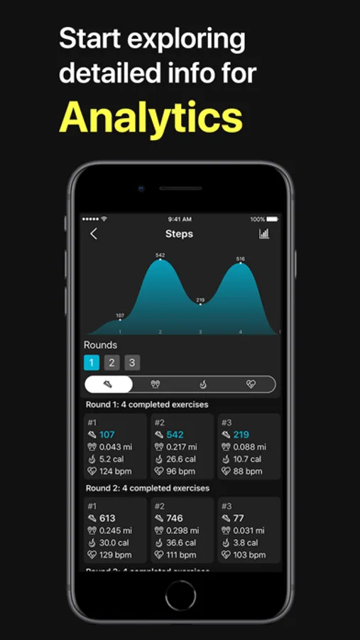 5. Finally, save all the results. View the history of all your workouts. Track and analyse your steps, distance, calories, average heart rate and overall results.