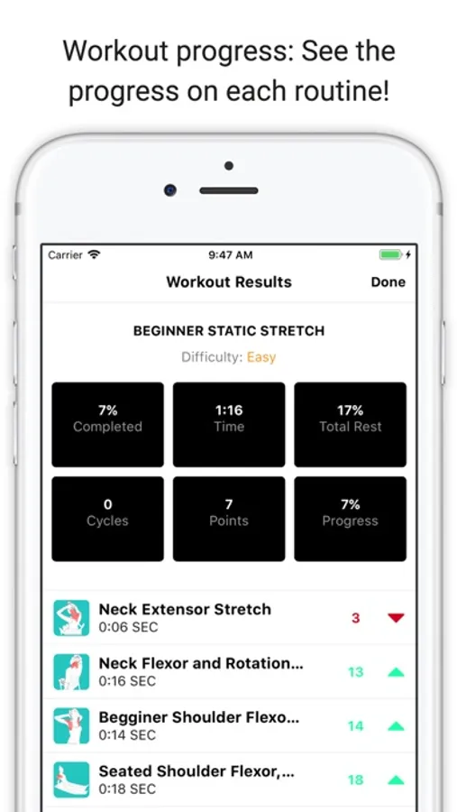 Exercise progress - see the exercises you did and how many repetitions or time.