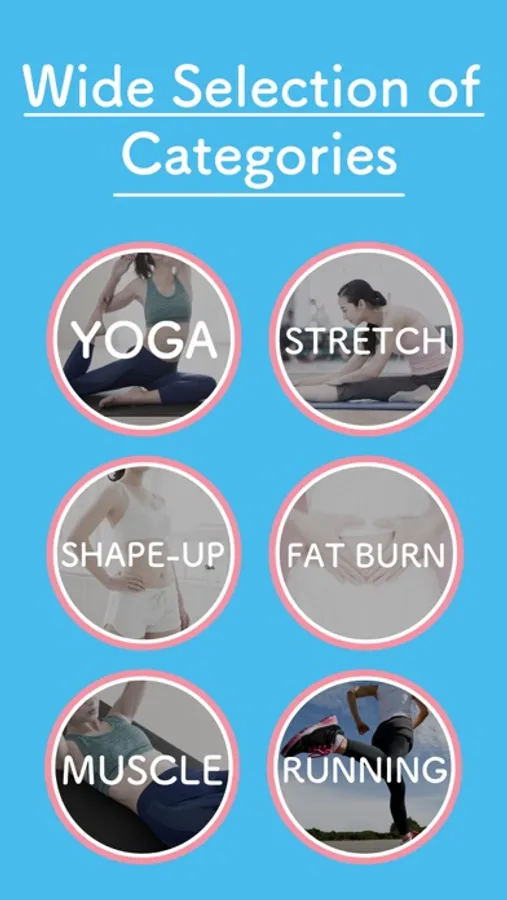 Included are: Fat Burn, Muscle Training, Shape Up, Stretches, Yoga, Pilates, Running, Breathing Methods