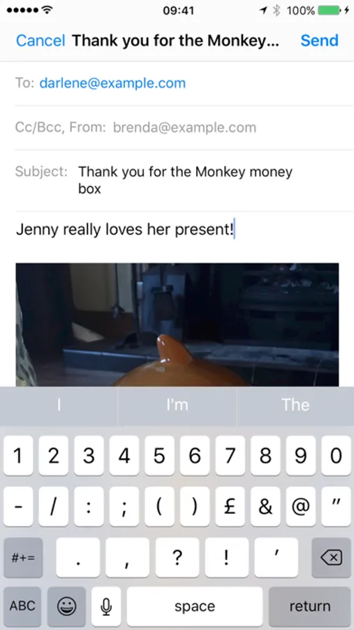 You can quickly attach photos from the camera or from your photo library. Remind yourself which novelty socks were which. Or add a photo of yourself wearing that new dress. Or of your baby sporting the hilarious t-shirt— then send a thank-you message to the giver, including photo!