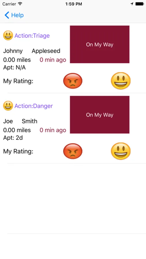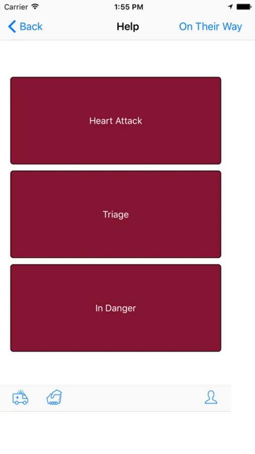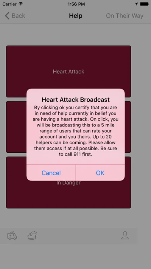 Once you sign up for an account and approve notifications and GPS location, the app landing screen has three large buttons. They are Heart Attack, Triage, and In Danger. Once a button is clicked, in regards to your situation, a message comes up certifying that you are in need of help and to call 911 first. This app is secondary to emergency services. Once you click ok, the app sends a broadcast notification to anyone that has downloaded my app in a five mile radius around you. When they go into the app and find you, they click On My Way and get led to a map screen with directions from their location to you. An apartment number is required during sign up if applicable as GPS coordinates only get a helper so far. Once there, she or he can help in any way deemed necessary. You, being in need, can click On Their Way at the top of the screen to see who is coming.