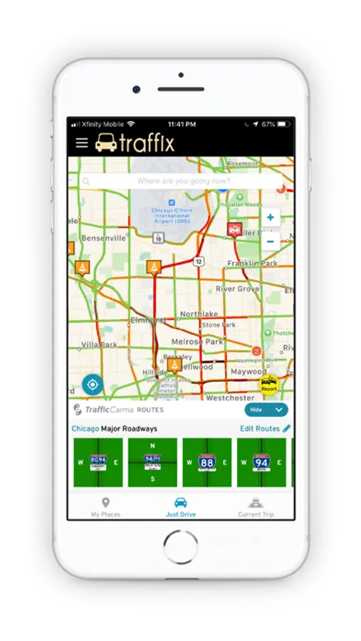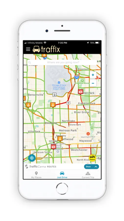 With Traffix, you can receive all of this information via the map and route segments or you can also listen to custom audio reports for your personalized routes to learn which roadway is best.