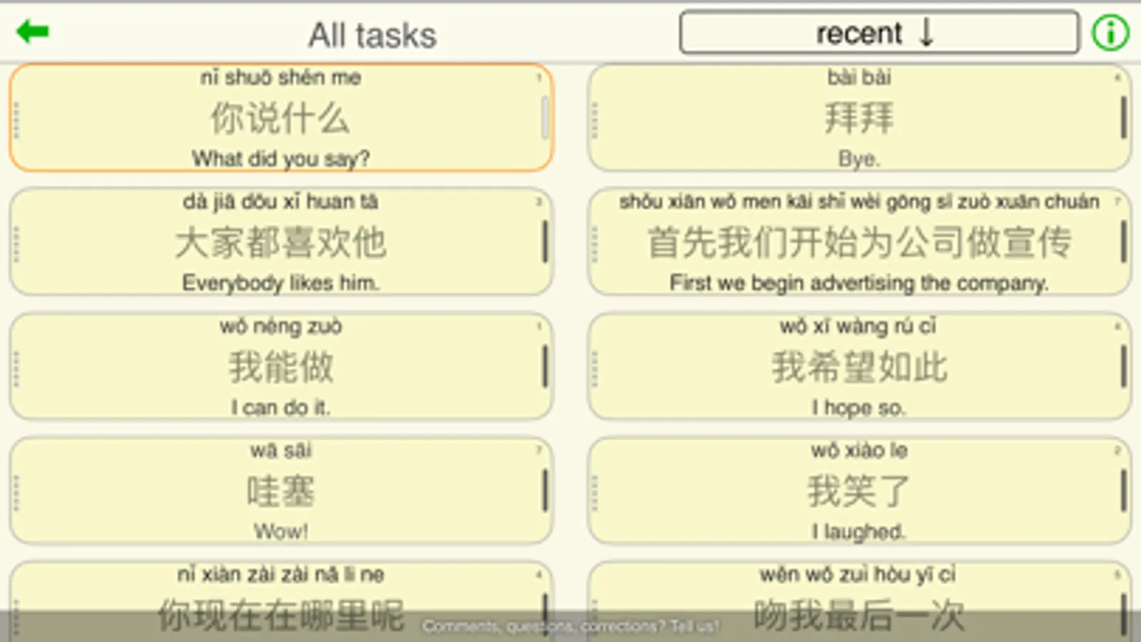 The goal of the game is to put the shuffled tiles in the right order to form a phrase. Scientific research shows that this type of tasks activates both semantic and episodic memory and will speed up your language learning progress.