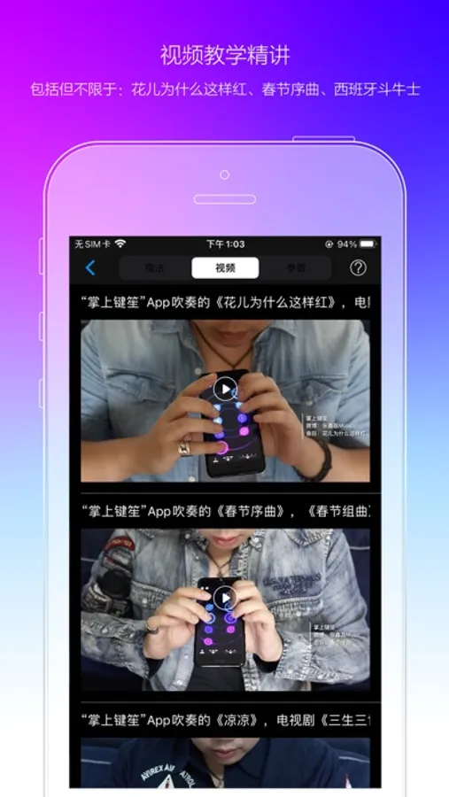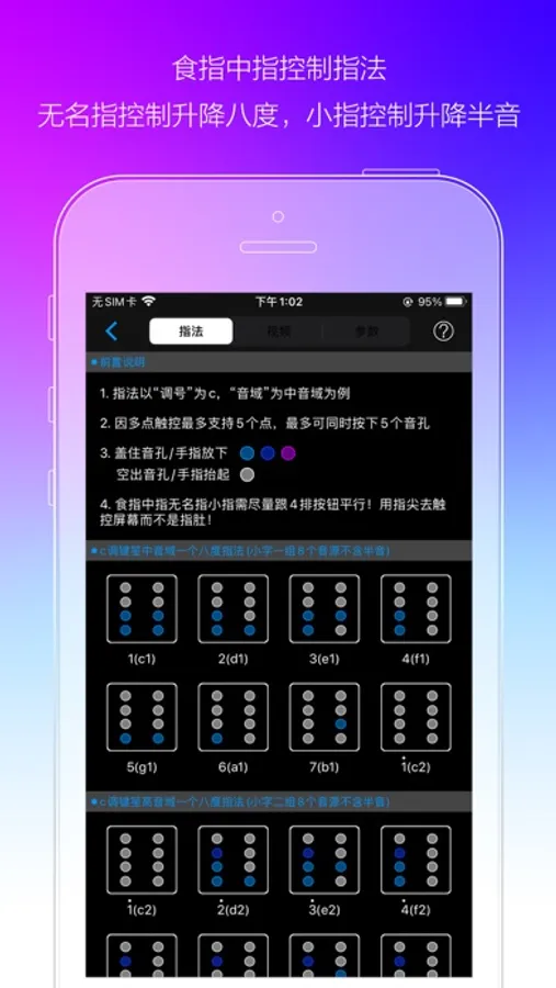 • 吹奏时,食指中指控制指法,无名指控制临时升降八度,小指控制临时升降半音,拇指用于掌控iPhone