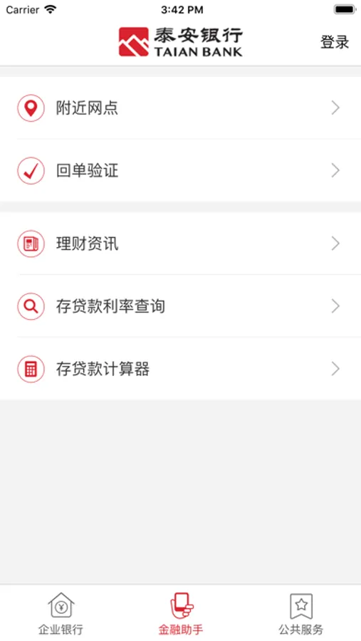 公众服务功能有:附近网点、回单验证、存贷款利率查询、存贷款计算器、外汇汇率等。