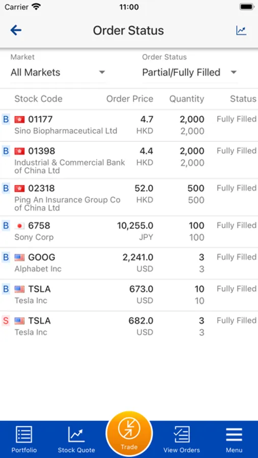 - Place order of any listed securities, including stocks, ETFs, ADRs, etc.