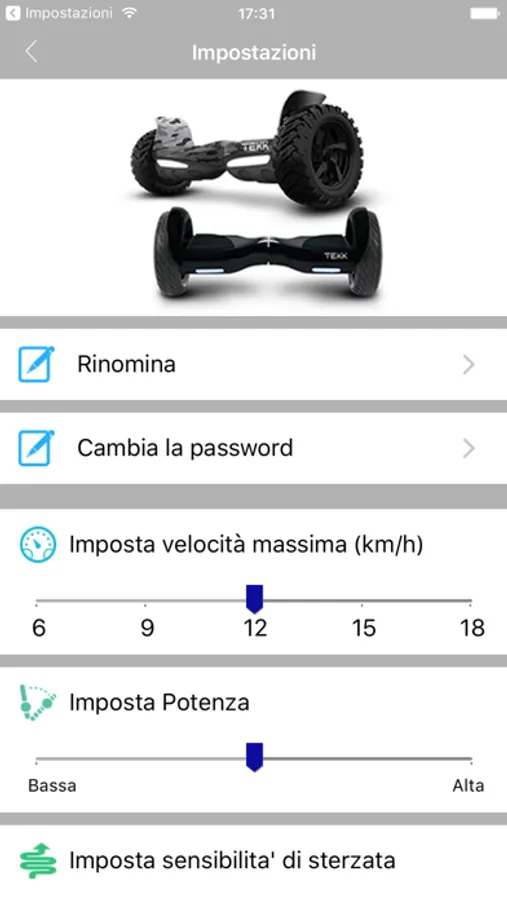 Una volta collegato il tuo Hoverboard TEKK potrai visualizzare la velocità massima, i km percorsi parziali e totali, regolare la velocità massima, la sensibilità di sterzata, la forza applicata sulle ruote e gestire il tempo di spegnimento