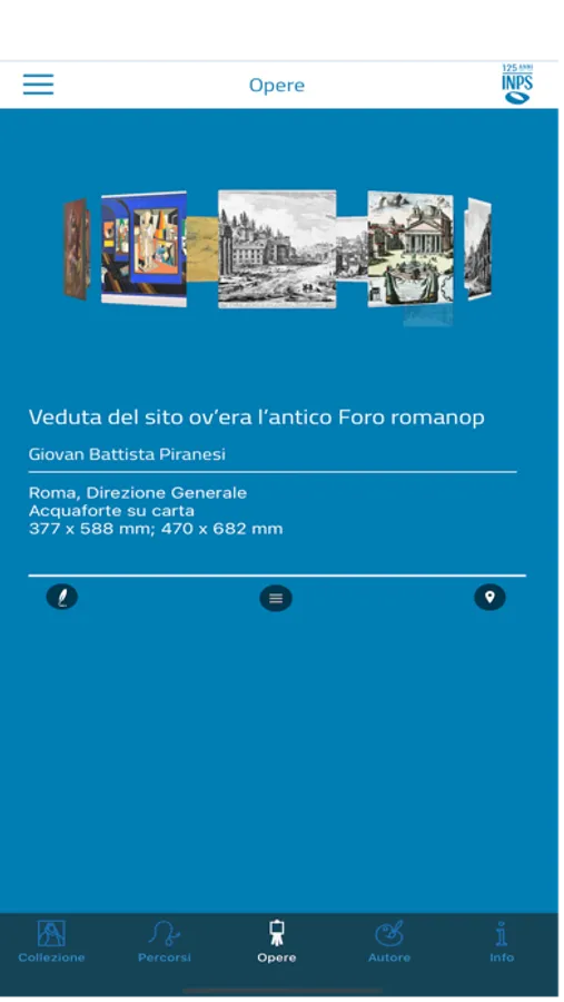L’ applicazione di INPS “INPS per l'Arte - Museo Multimediale” permette di visualizzare il patrimonio artistico dell'INPS e raccoglie opere mobili e immobili di grande importanza, acquisite o realizzate nel corso di un intero secolo ed oggi dislocate tra i diversi ambienti di rappresentanza e i singoli uffici dell'Istituto.