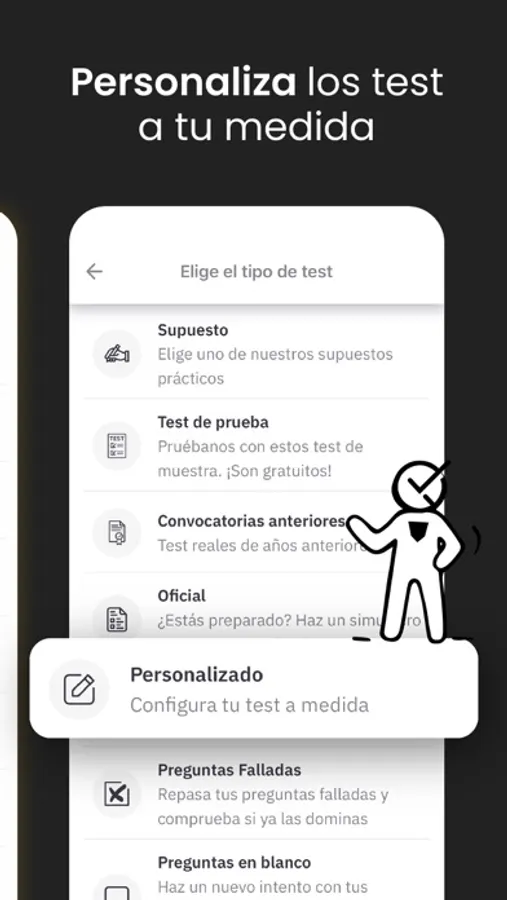 Personaliza tu test de oposiciones por: materia, temas, preguntas falladas, preguntas en blanco, simulacros, exámenes oficiales… Practicarás haciendo test aleatorios y diferentes.