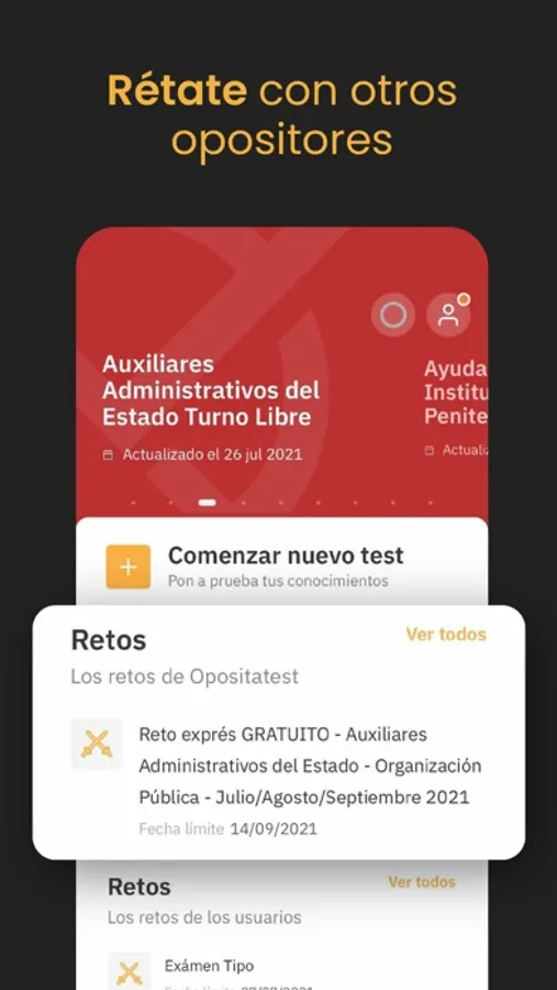 Tendrás la oportunidad de hacer tests y exámenes generados por otros opositores y medirte con ellos en tu oposición.