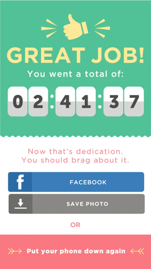 The Put Your Phone Down app is designed to make getting (and staying) off your phone a little easier. Whether you’re enjoying time with friends and family or taking a bit of time for yourself to relax, you’ll be racking up time and bragging rights!