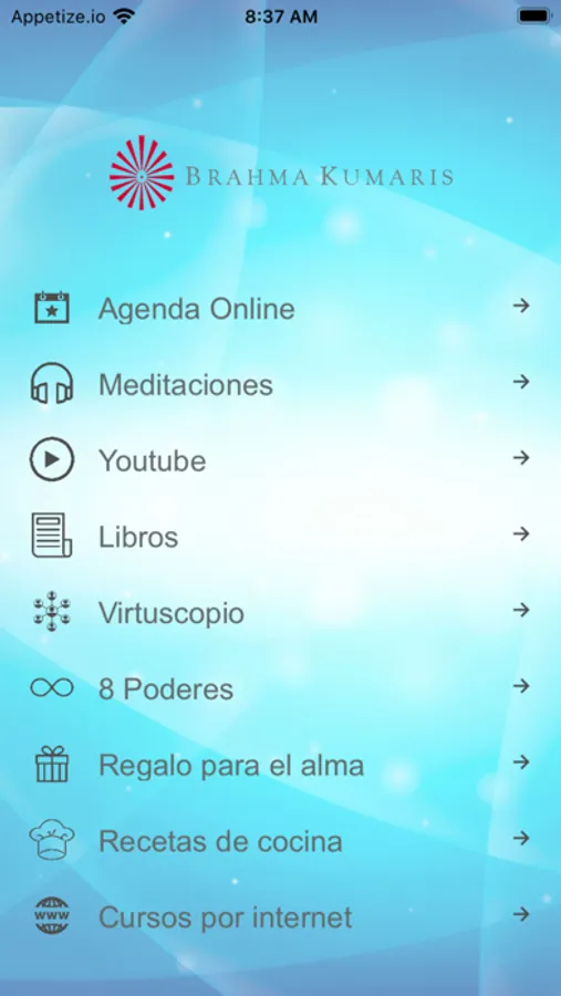 Aplicación gratuita de Brahma Kumaris sin publicidades donde las personas pueden consultar la agenda de actividades libres y gratuitas de la organización ya sea presenciales u Online al mismo tiempo que pueden utilizar en linea más de 20 Cds de meditación y descargar libros sobre espiritualidad sin costo. Al mismo tiempo contiene dos actividades de entretenimiento educativo llamado Virtuscopio y 9 Poderes donde las personas pueden jugar y al mismo tiempo obtener reflexiones en él.