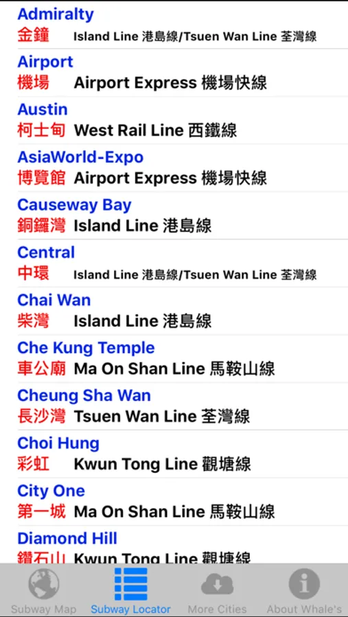 ● Subway line legend, large and small line markers, pan and zoom capabilities, and clear, easy to read English and Chinese fonts, make this the perfect app for navigating the Hong Kong MTR system.