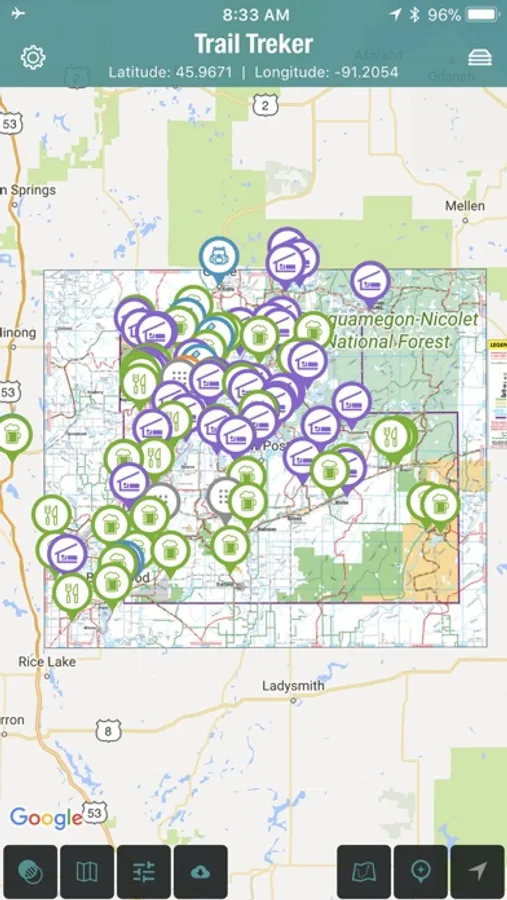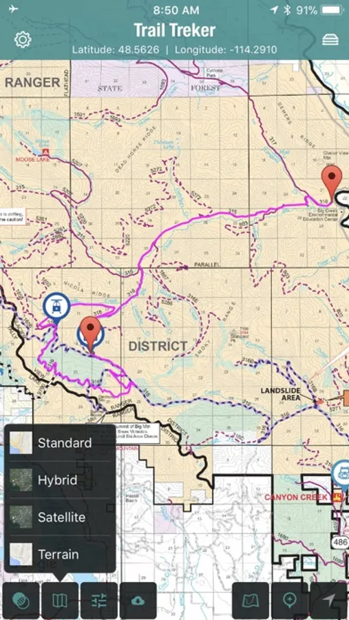 Show Trail map overlaid on various Google maps (Standard Street, Terrain, Satellite)