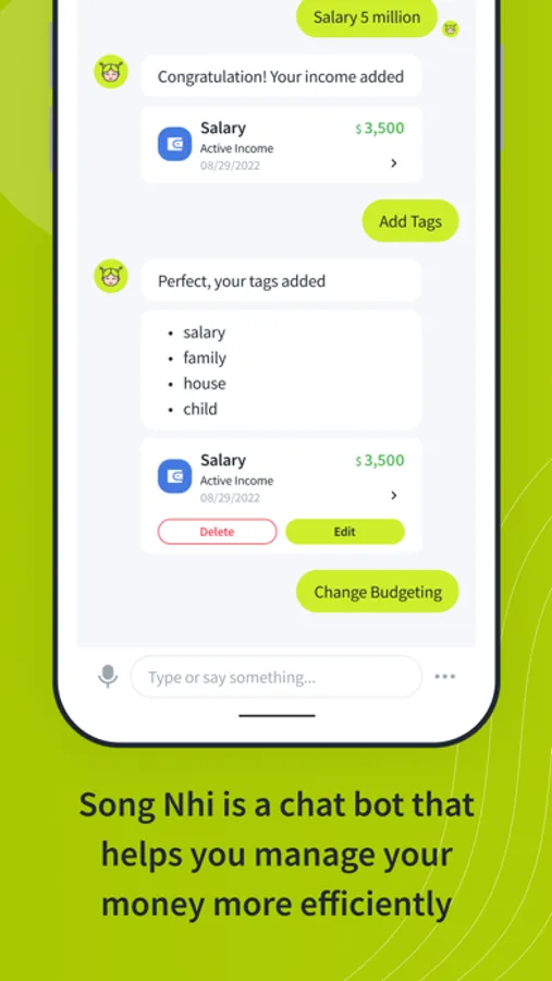 Chat with Song Nhi whatever your needs, for example “salary $5000” or “gas $50” to add an income or expense, “Show last month report” to view your financial report. Your conversation with Song Nhi might not be only about finance but also any other topic that might cheer you up. You are no longer lonely in your journey to financial freedom because Song Nhi is always available 24/7.