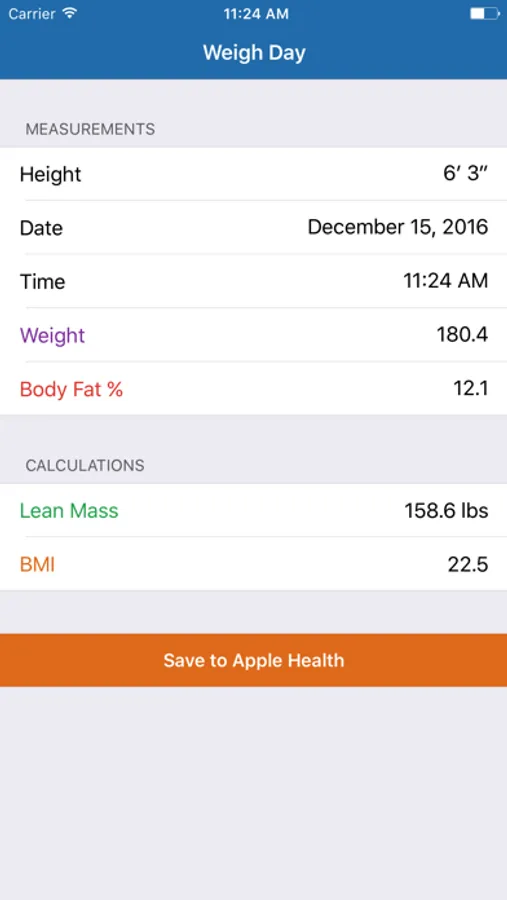 If you have a regular bathroom scale, you can enter your weight, body fat percentage, and height, and Weigh Day will calculate your lean mass and BMI then save all four measurements into Apple Health.