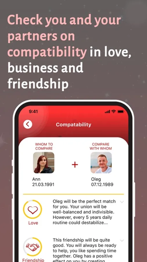 - calculate compatibility in Love, Friendship and Business with your friends, relatives and acquaintances;