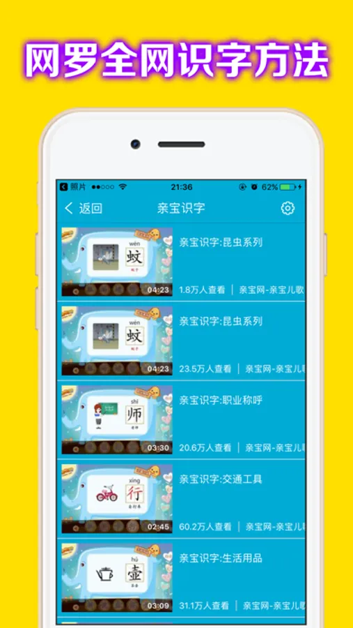 其中包括了巧虎学汉字、米卡学汉字、智象识字、亲宝识字、蓝猫小学识字、宝宝巴士学汉字、洪恩识字神童、洪恩识字、看图识字等近30个系列识字教育。肯定有一个适合您的宝宝的。