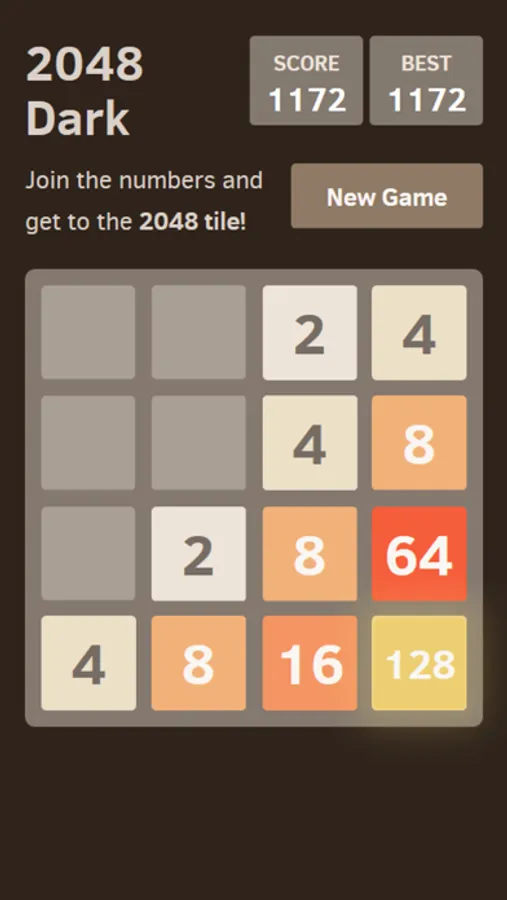 You can play 2048 dark game by joining tiles with the same numbers to convert them to another tile which has a value as the sum of the tiles joined (ie. 2+2=4, 4+4=8, 8+8=16 ..) Your aim in the game is to reach a 2048 tile by joining two 1024 tiles. When you reach 2048 you win the game but you can choose to continue for higher points.