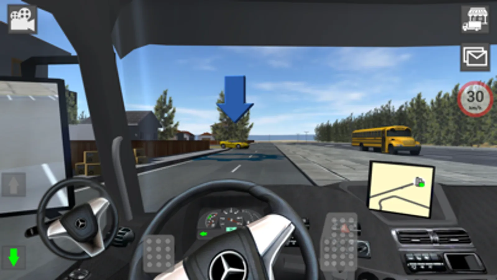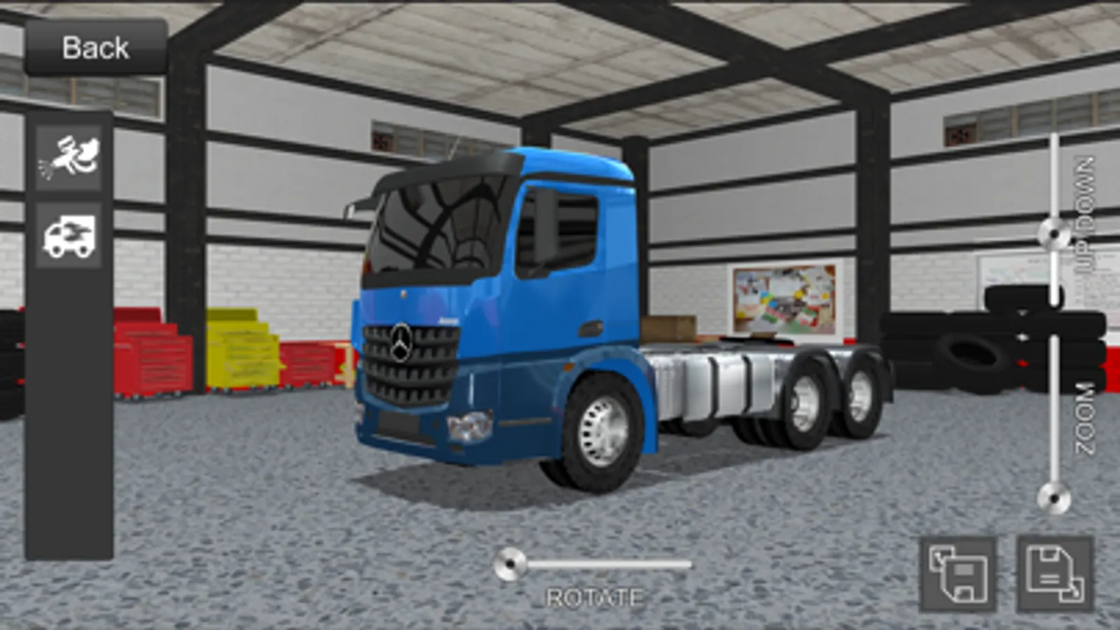 In the upper right you will find the Shop button that will present the Mercedes-Benz truck models available in the simulator.