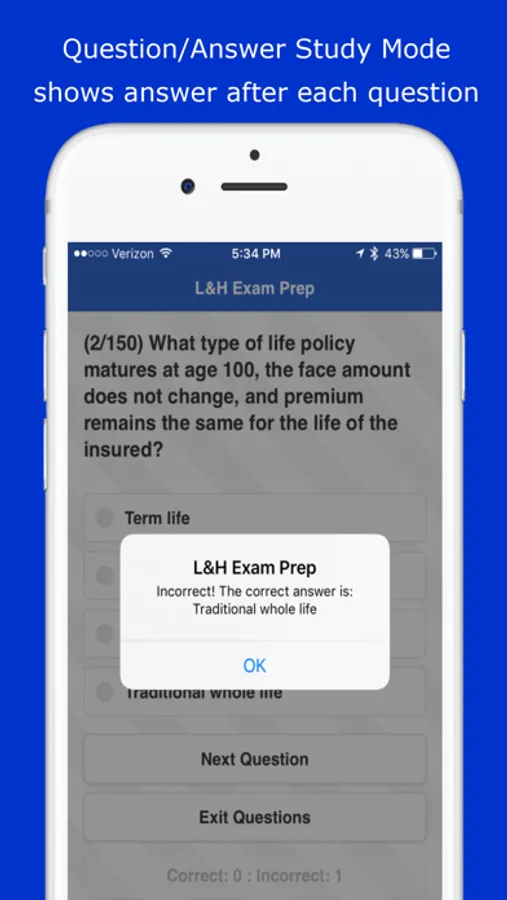 Study mode - App will randomly shuffle through each question in the database. While in study mode, the app will show you the correct answer after each question and keep track of your score at the bottom.