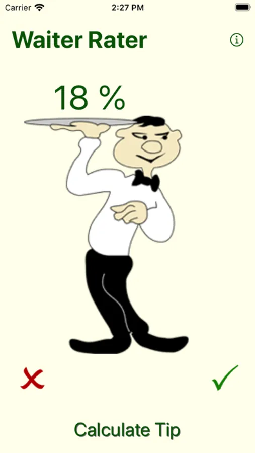 Use The Waiter Rater to rate your server. Set your default tipping percentage and if the server does something good then tap the check mark to increment your tip percentage by one. If your server does something bad then tap the X mark. At the end of your meal you will have the tipping percentage that your server earned.