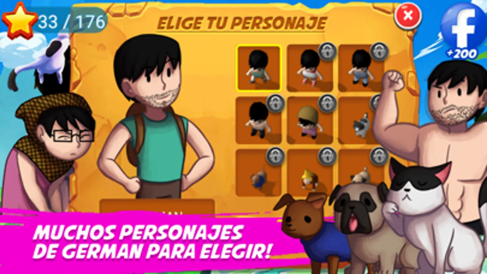 Acompaña a German en esta aventura. Evita los obstáculos, recolecta las monedas, descubre y accede a diferentes personajes que reconocerás. Juega y explora 4 Mundos y 100 Niveles que incluyen Ruinas, Desiertos, Islas Volcánicas y Montañas heladas.
