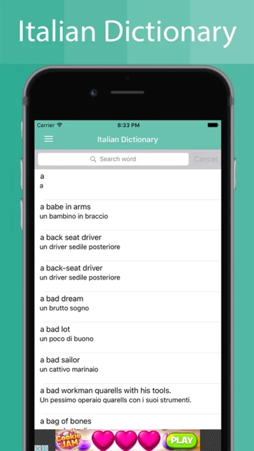 ITALIAN Dictionary is an INTELLIGENTLY crafted app that caters ALL YOUR ENGLISH TO ITALIAN WORDS MEANINGS NEEDS - Be it for COOKING, TRAVEL or SIMPLE WORDS MEANING in general!
